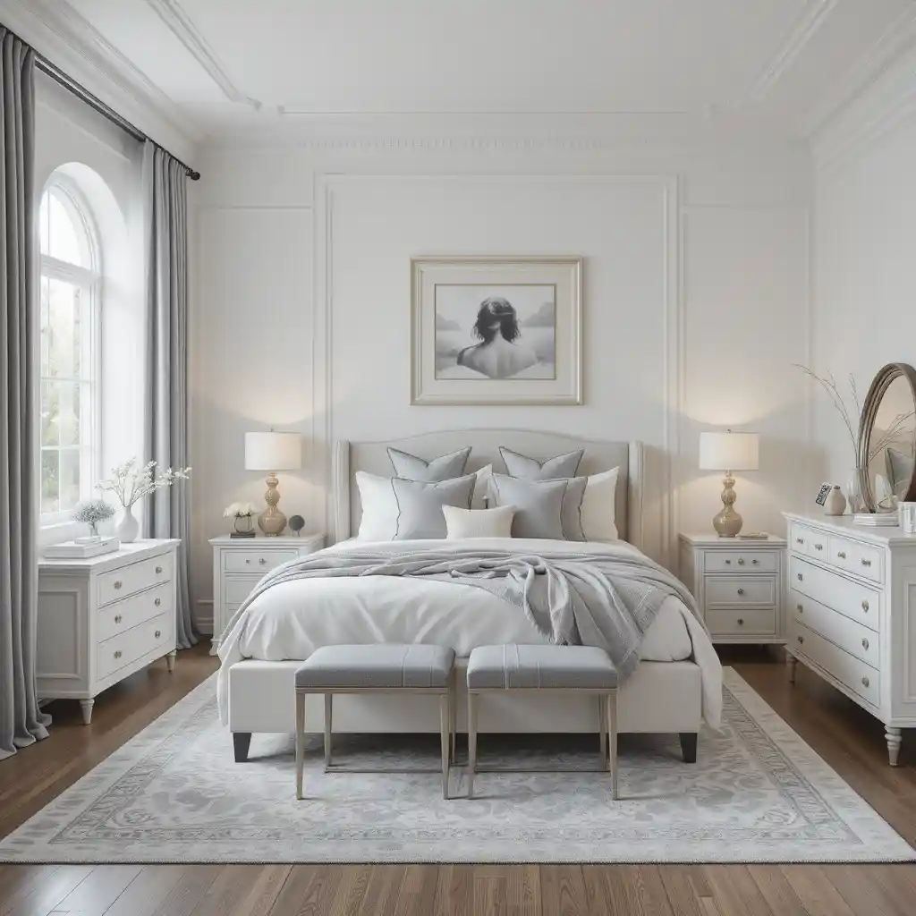 Style your space with white nightstands and dressers, then incorporate grey curtains, pillows, or area rugs to bring in coziness and dimension. White and Grey Bedroom