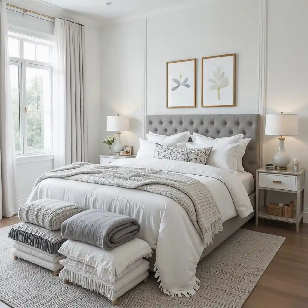 Stack soft throws in shades of white and grey at the end of your bed for a cozy, textured look that invites relaxation.