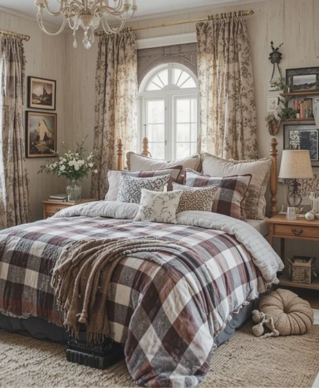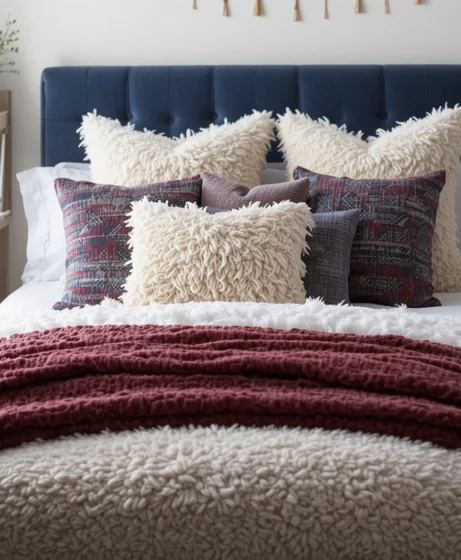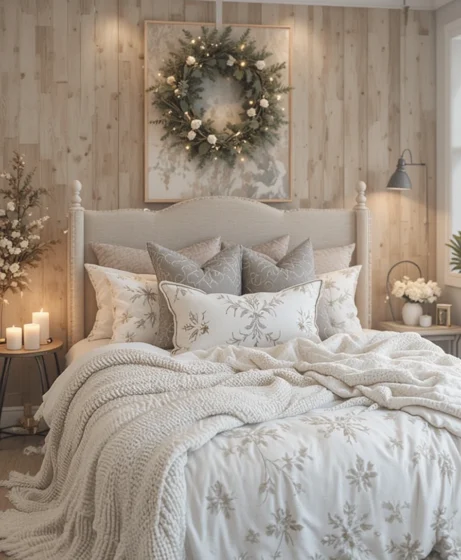 Mix pillows in velvet, knit, sherpa, or faux fur for a warm layered look. Use winter colors like burgundy, cream, gray, and navy. The texture mix makes your bed feel plush and welcoming Winter Bedroom.