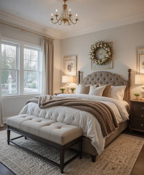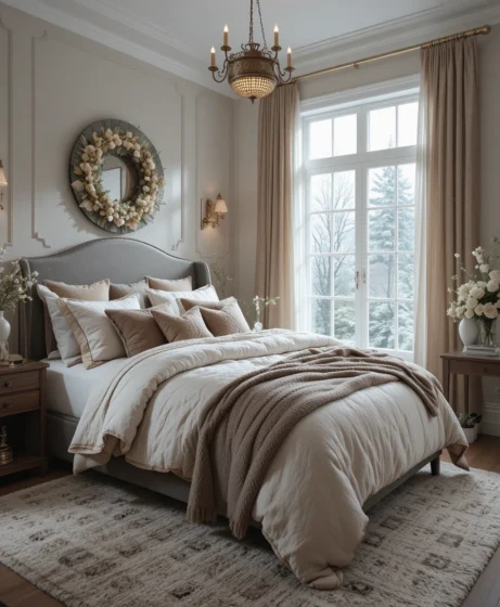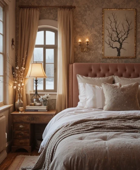 Gold, bronze, and copper tones warm up a winter bedroom instantly. Add them through lamps, frames, hardware, or candleholders. These metallic accents reflect light beautifully during dark winter months Winter Bedroom.