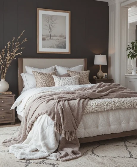 Layering blankets adds both warmth and visual texture. Look for throws made from fleece, sherpa, or chunky knit materials. Drape them at the foot of your bed for a cozy, inviting look Winter Bedroom.