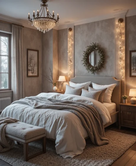 Cold lighting can make a winter bedroom feel harsh, so switch to warm-tone bulbs. Add table lamps, floor lamps, or twinkling lights for soft ambiance. The gentle glow transforms the entire room into a warm retreat.