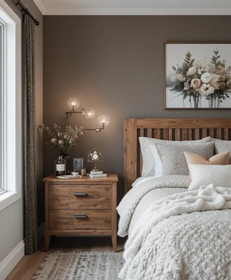 Wood naturally warms up the look of a bedroom. Add wooden nightstands, a rustic dresser, or even a wood-frame bed. Warm woods like walnut, pine, and oak bring a cozy winter cabin feel.