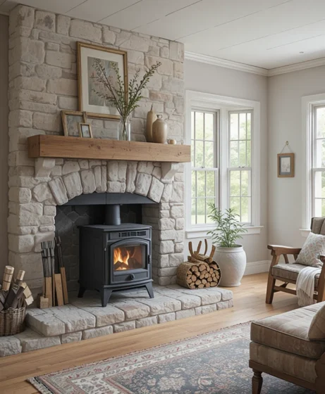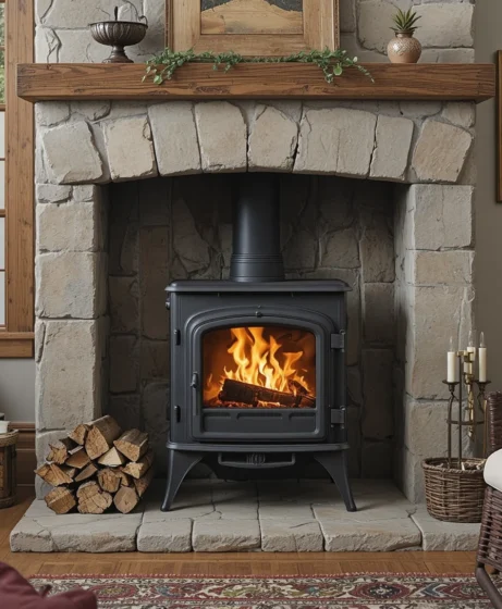 Pairing a wood burning stove with a natural stone surround creates a dramatic centerpiece. The stone retains heat and enhances the cabin-style aesthetic many US homeowners love Wood Burning Stove.