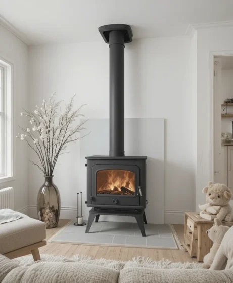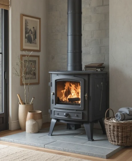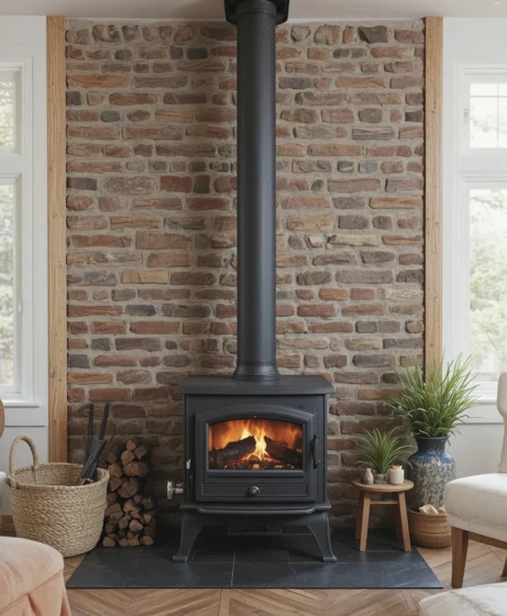 In larger homes, a powerful freestanding wood stove provides both heating and a strong visual anchor. It fills expansive spaces with warmth and becomes the room’s main feature Wood Burning Stove.