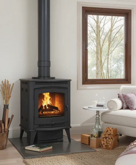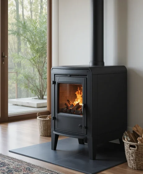 For contemporary homes, a sleek black steel wood burning stove offers simple lines and understated elegance. Its compact shape fits neatly into modern living rooms while still delivering strong heating performance.