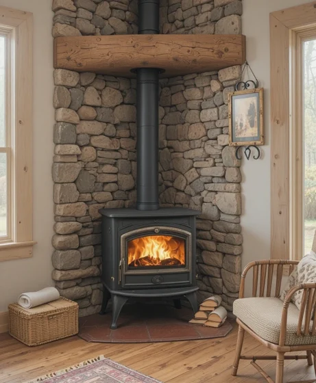 A corner installation maximizes space without sacrificing style. This setup works perfectly in cabins, tiny homes, or apartments. It creates a cozy focal point while keeping the floor plan open.