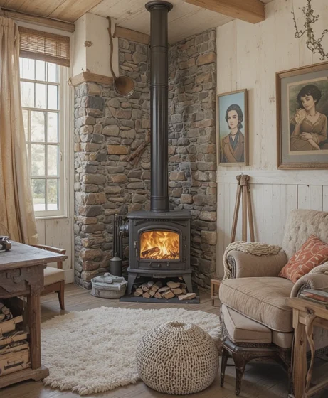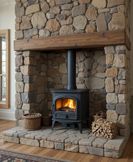 5. Rustic Stone Surround Wood Stove