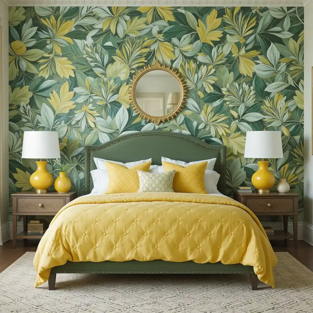 13. Incorporate Leafy Wallpaper with Yellow Accents