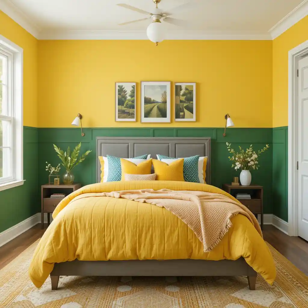 Paint your wall half yellow and half green using a chair rail or clean dividing line. This color-blocking adds playful energy and visual balance.