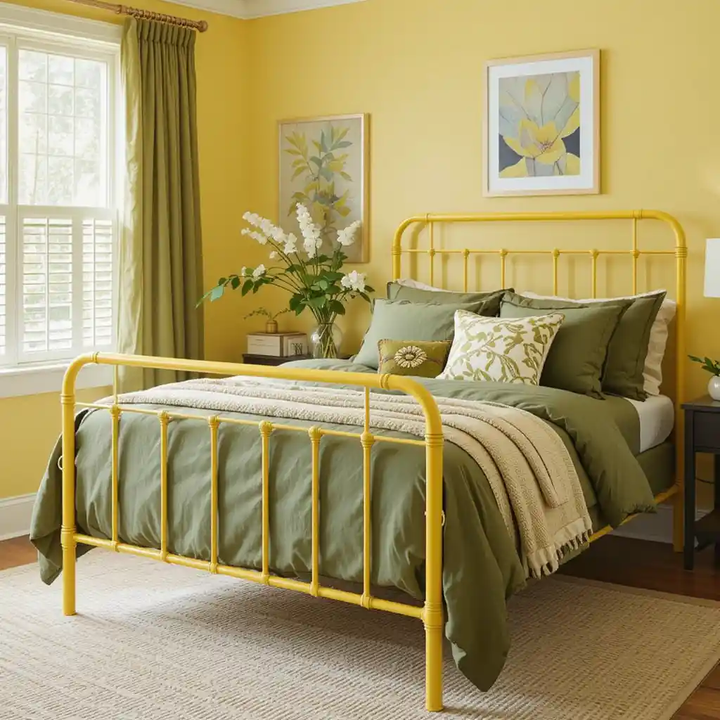 A yellow-painted metal or wood bed frame becomes the centerpiece against olive green sheets and duvets, combining brightness with calm. Yellow and Green Bedroom