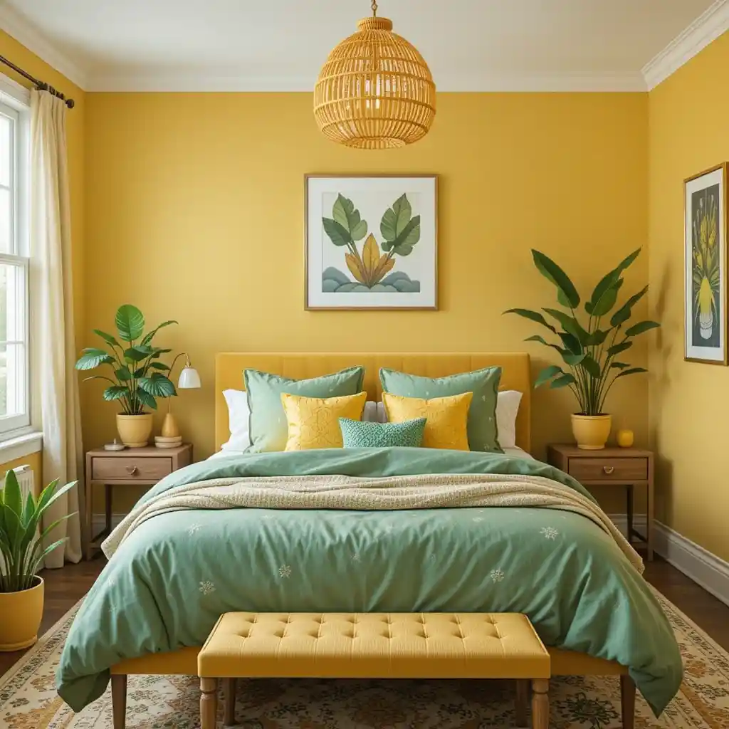 Yellow and green are nature’s happiest pair. When blended in a bedroom, they bring balance—yellow adds cheerfulness, while green brings calm.