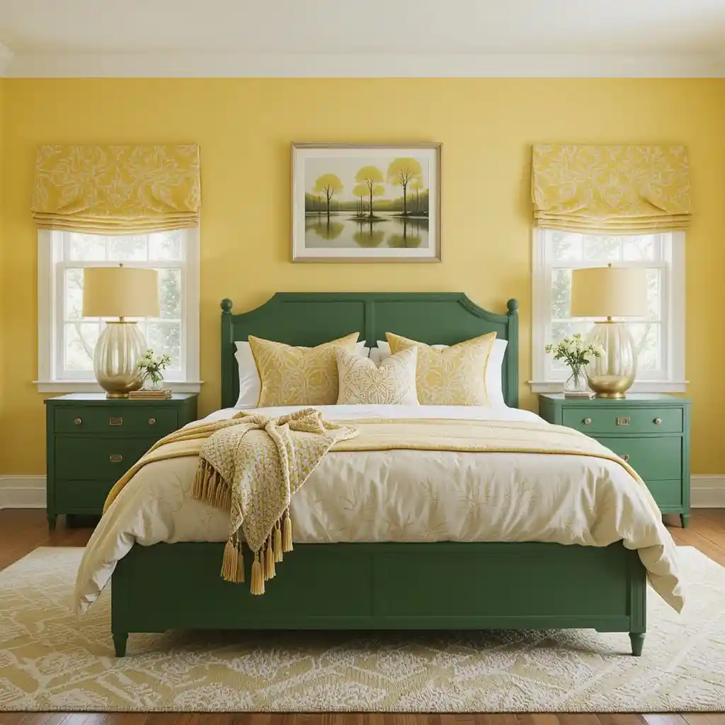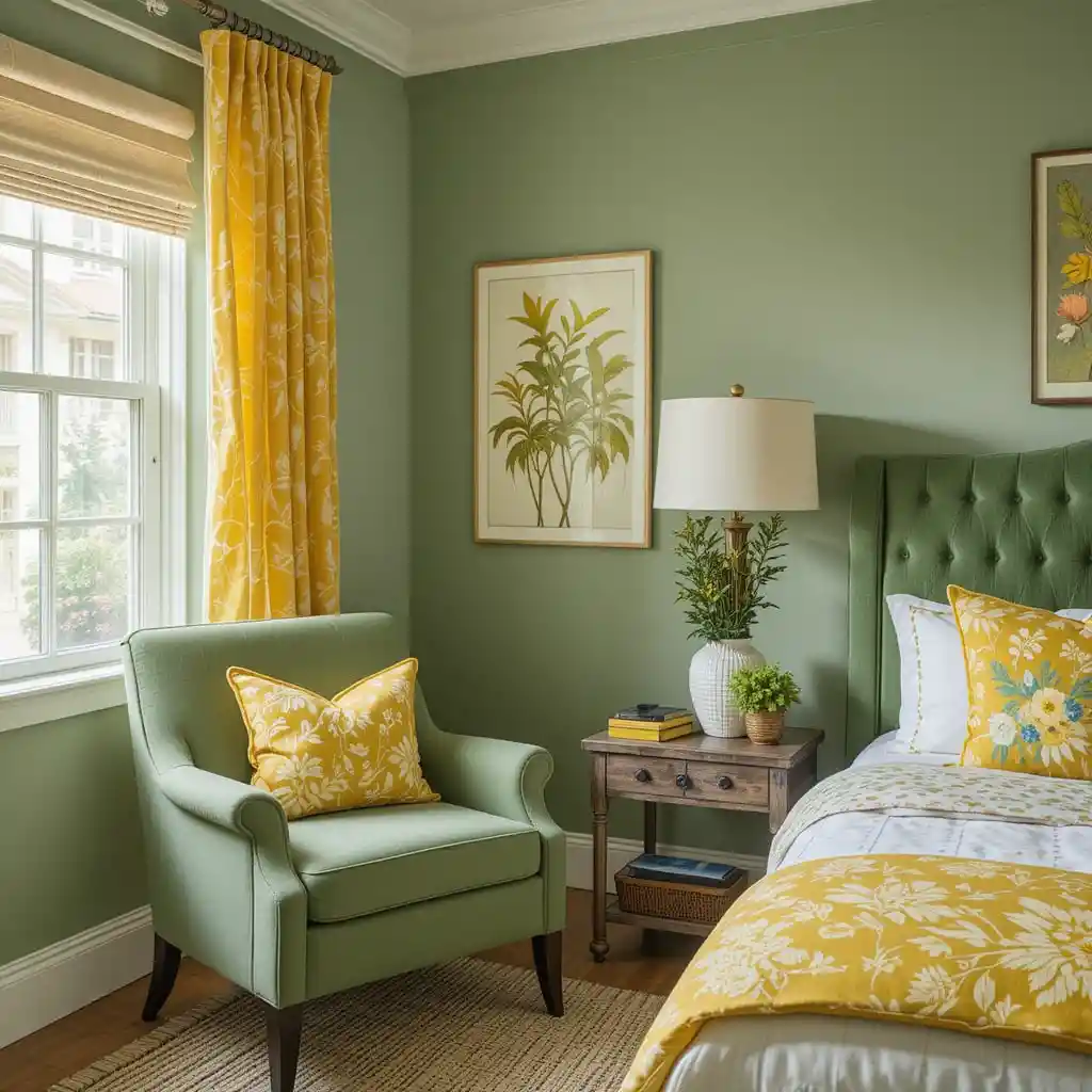 For a restful look, combine mossy green accent pieces with light linen yellow curtains that flow softly and let natural light filter through. Yellow and Green Bedroom