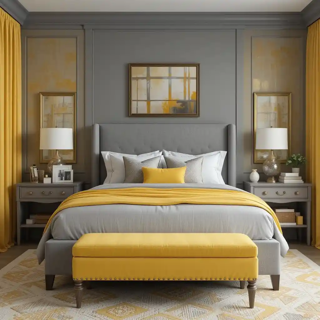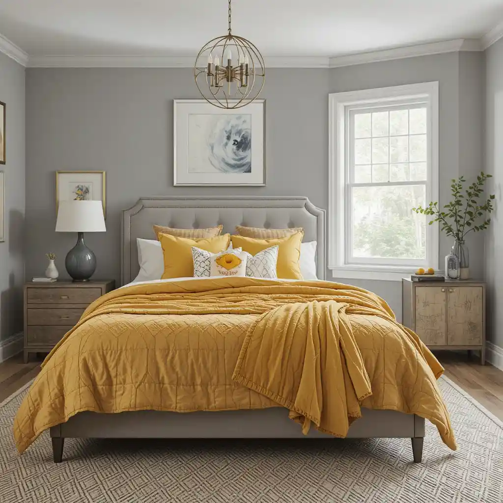1. Grey Walls with Mustard Yellow Bedding