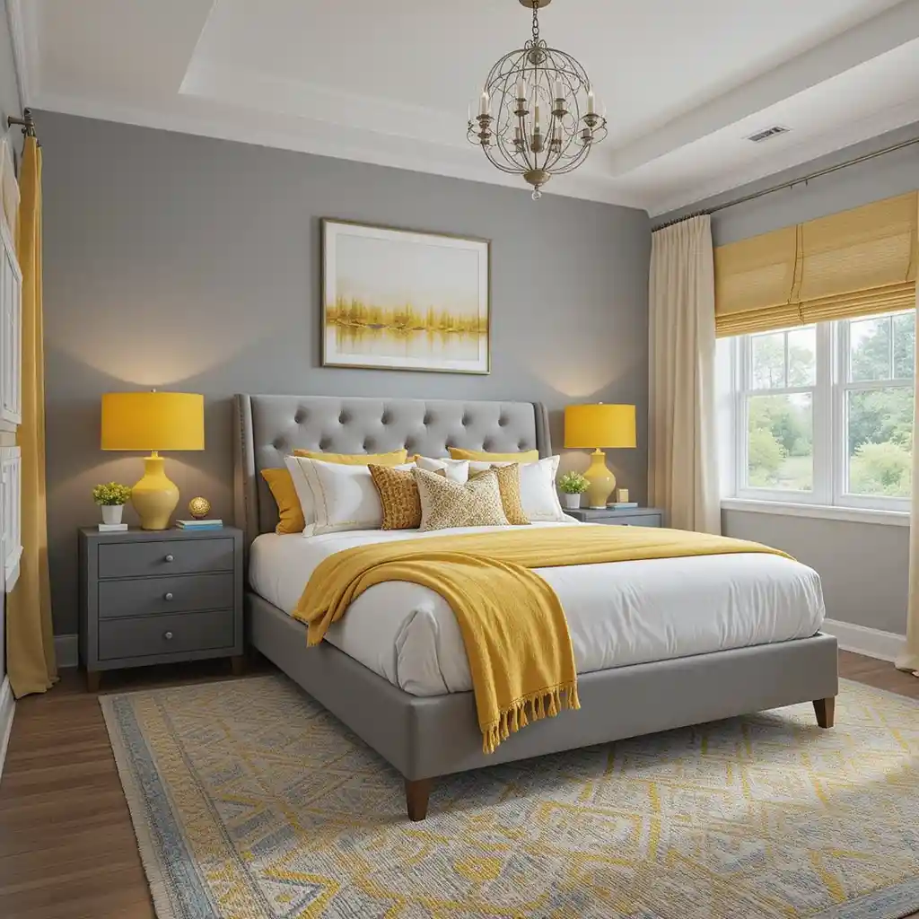 Choose yellow table lamps or lampshades to place on sleek grey nightstands. This pairing balances functionality with design impact. Yellow and Grey Bedroom