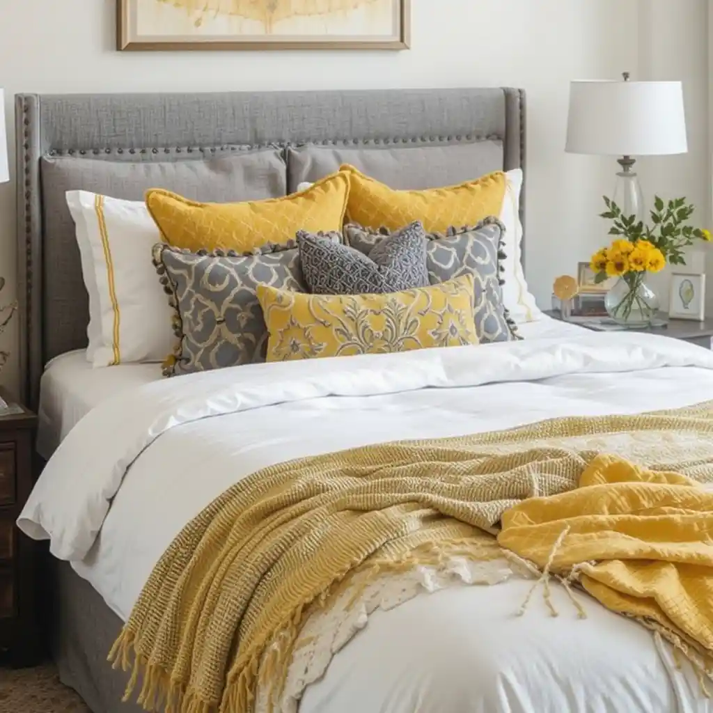 3. Grey Upholstered Bed with Yellow Accent Pillows