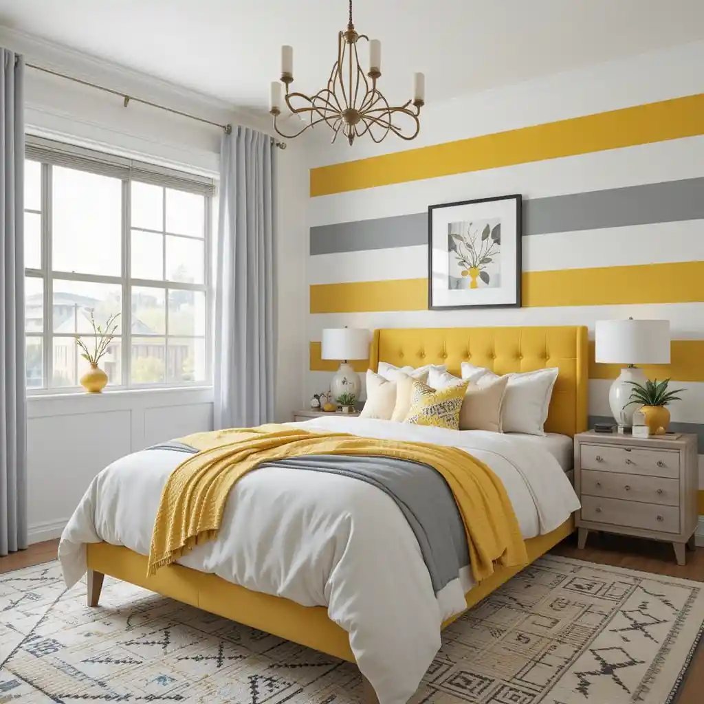 Create an accent wall with alternating yellow and grey horizontal stripes for a bold, modern look that draws focus without needing extra decor.