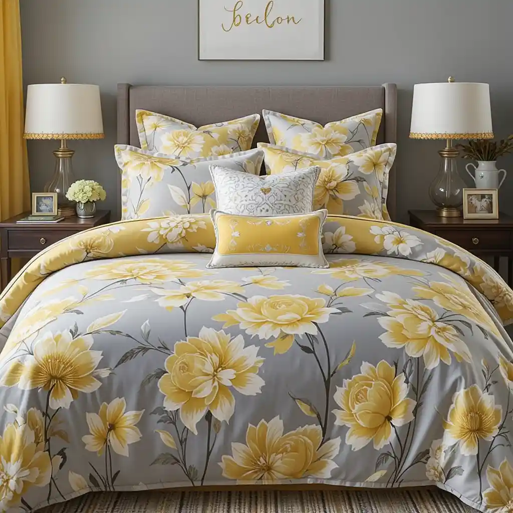 18. Grey Bedding with Yellow Floral Prints