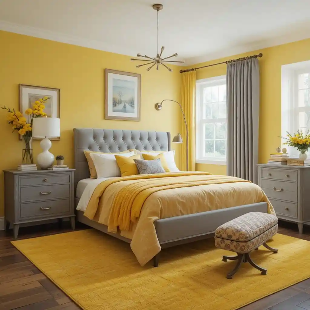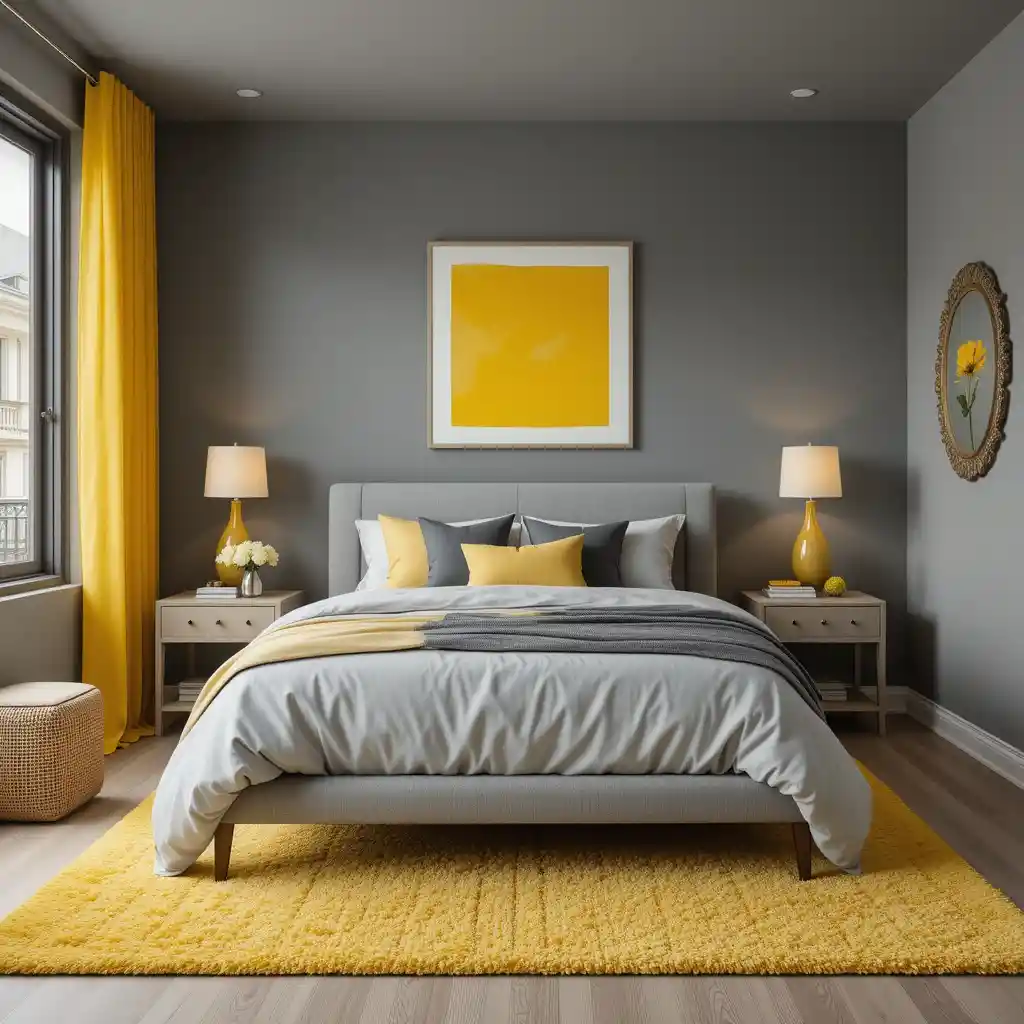 Ground the space with a bright yellow area rug and let your grey nightstands or dresser tone it down with soft contrast.