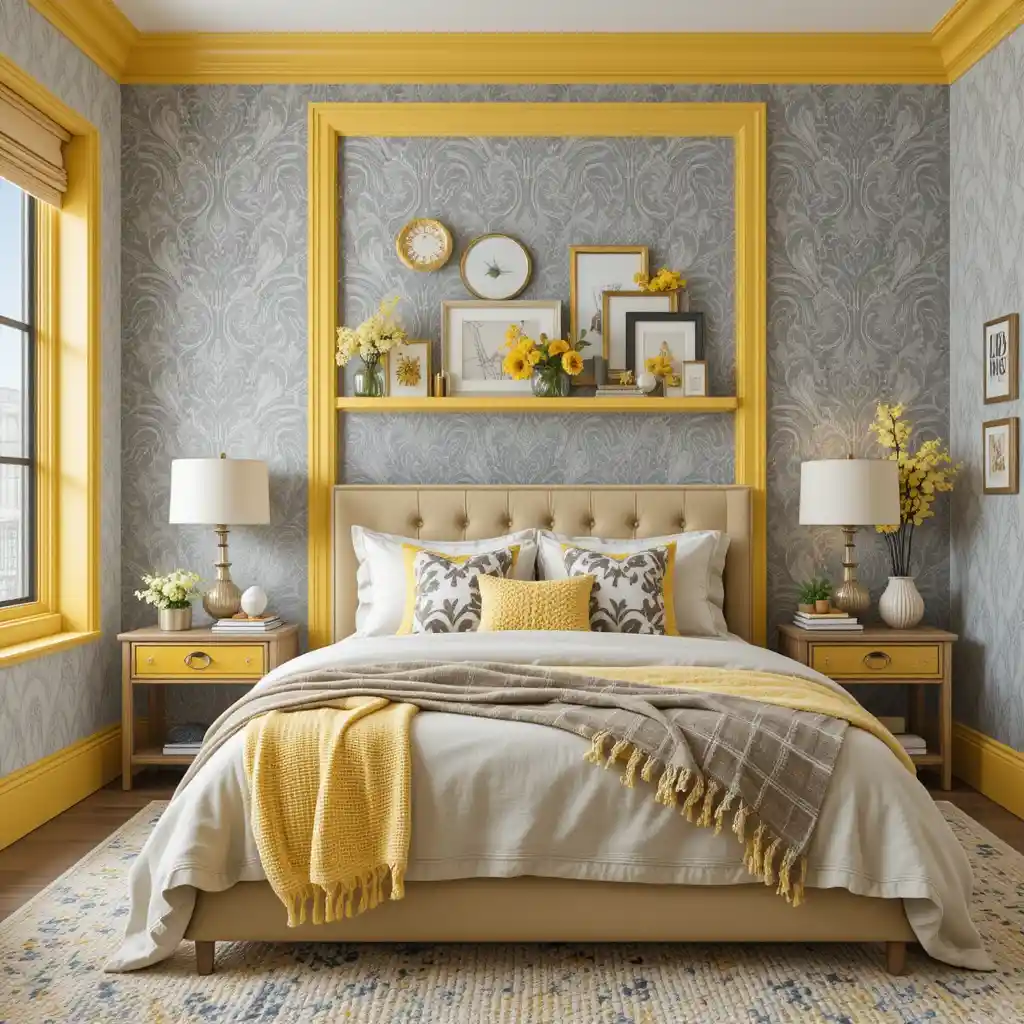 Install subtle grey patterned wallpaper and frame it with yellow trim, picture frames, or floating shelves to blend structure with brightness. Yellow and Grey Bedroom
