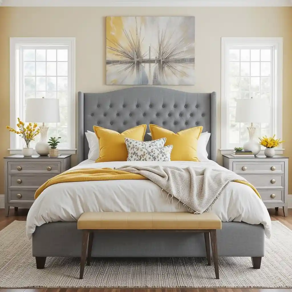A grey tufted headboard or bed frame offers a neutral base, which pops with bright yellow throw pillows for contrast and energy.
