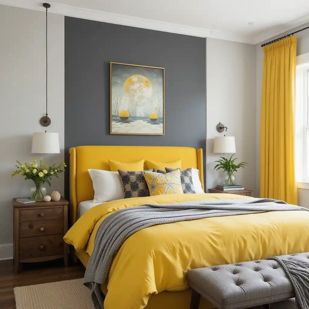 7. Grey Accent Wall Behind a Yellow Bed