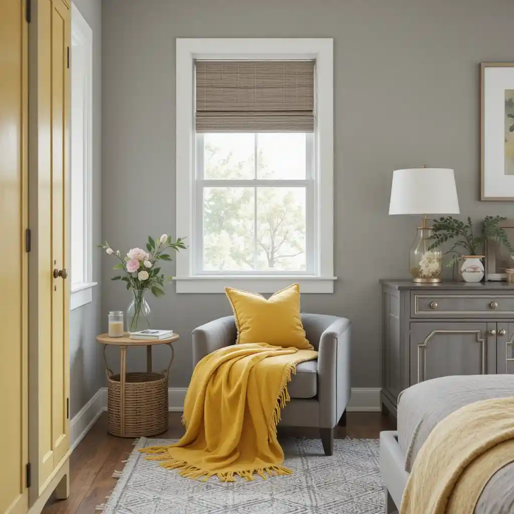 Place a plush grey armchair in a corner and toss a yellow throw blanket over it to create a cozy reading nook full of personality.
