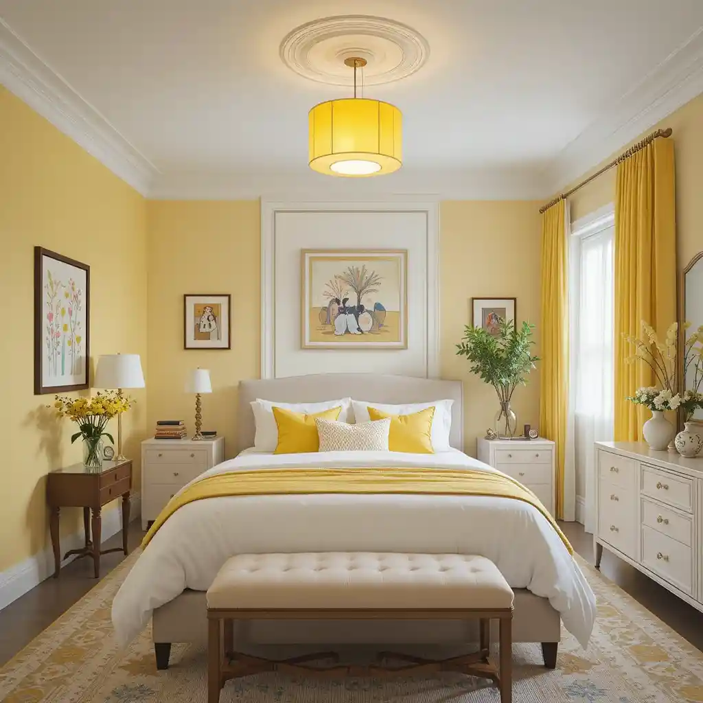 Add a yellow pendant or chandelier to a room with a white ceiling. This eye-level pop of color acts like a functional accessory. Yellow and White Bedroom