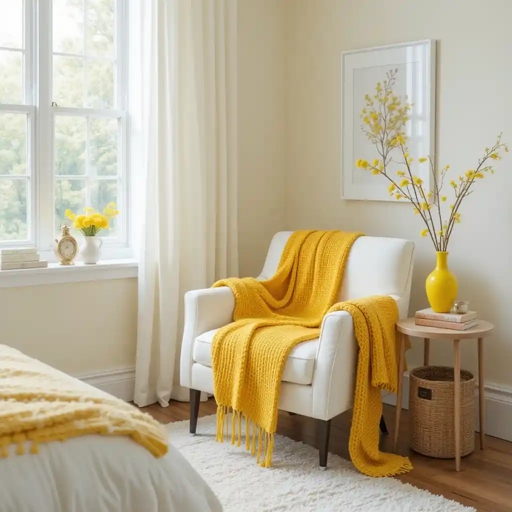 Add a cozy yellow reading chair to a clean white-walled corner, creating a cheerful nook perfect for morning coffee or quiet moments.